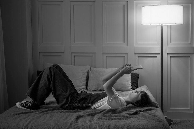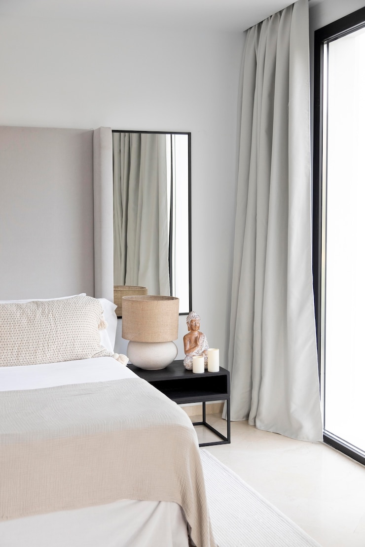 В нем сглаживаются границы между белыми и черными элементами. Серые оттенки заполняют промежутки между насыщенным черным, ярким белым и древесными тонами. Прикроватная тумбочка, рама кровати и другая мебель должны иметь плавные или округлые формы.