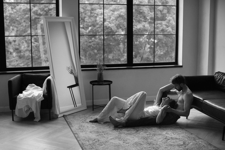 Палитра серых тонов смягчит пространство и размывает резкие границы между черно-белыми цветами.