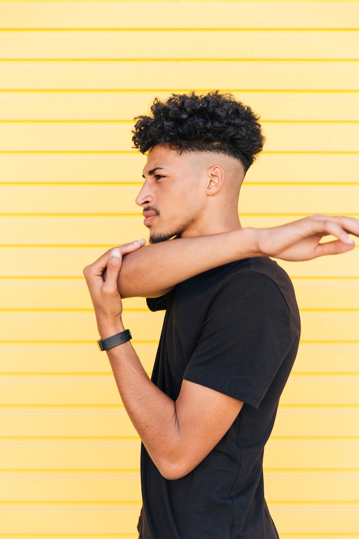 Лысый фейд – обязательный элемент стрижки, но средний фейд тоже выглядит отлично и может стать хорошим выбором. Верхнюю часть укладывают руками для создания эффекта небрежности.