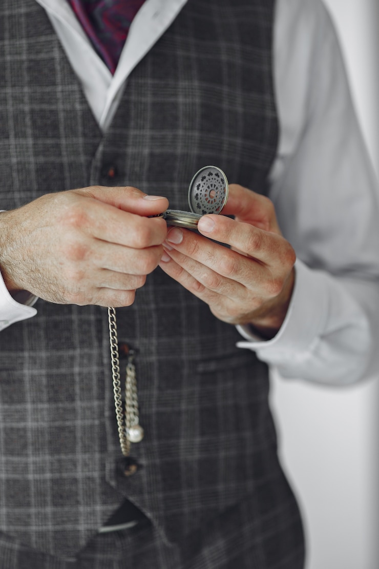 В старину мужчины прикрепляли к короткой цепочке золотую или серебряную пуговицу и пропускали её сквозь отверстие в манишке для соединения рубашки с пиджаком.