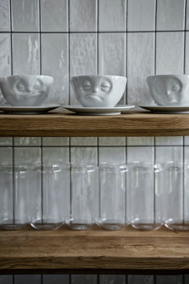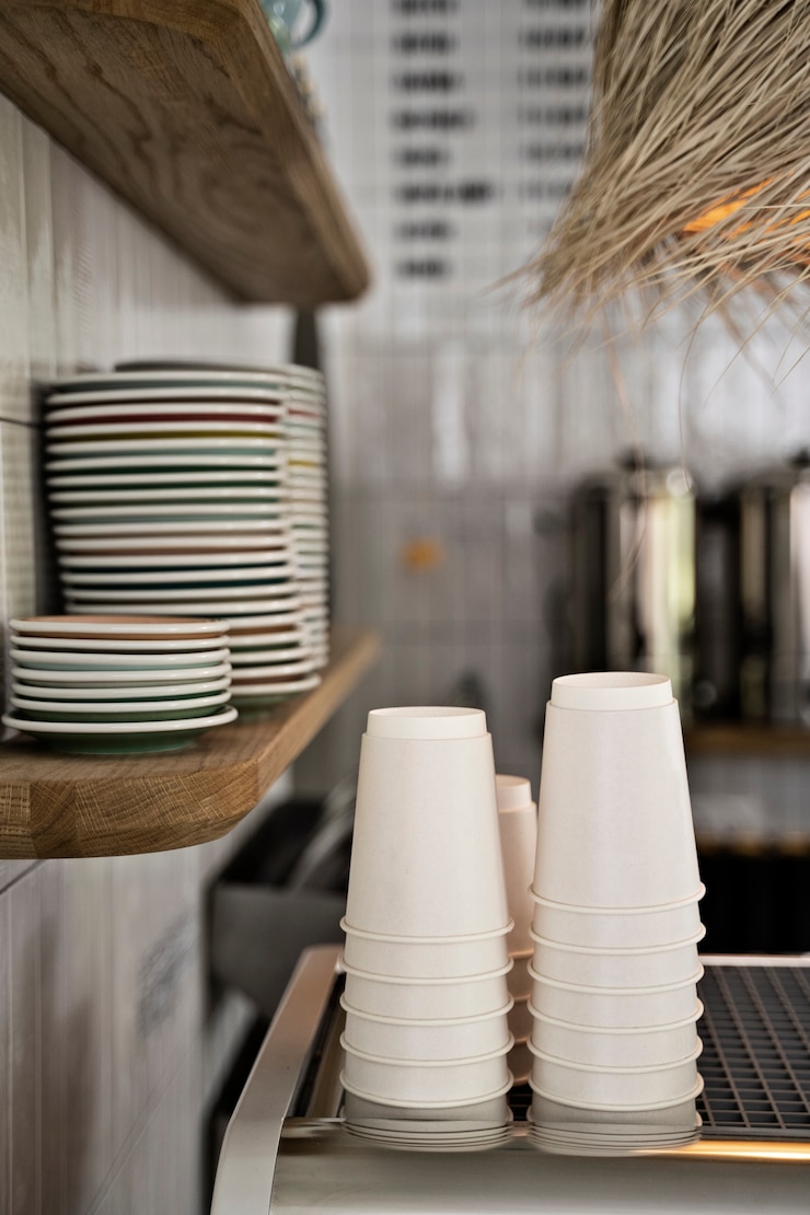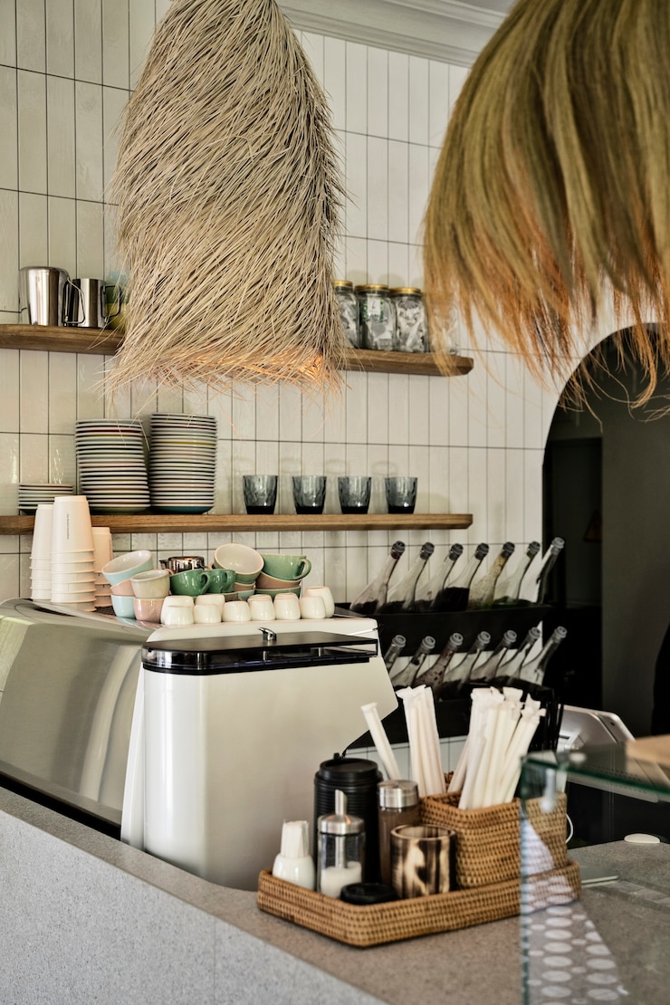В баре стоит подумать о месте для кофе. Возможно, туда подойдут металлические стеллажи или деревянные полки у конца, где разместят сахар, сливки, кофе и чашки.