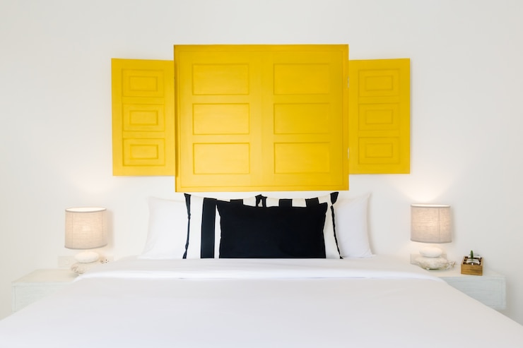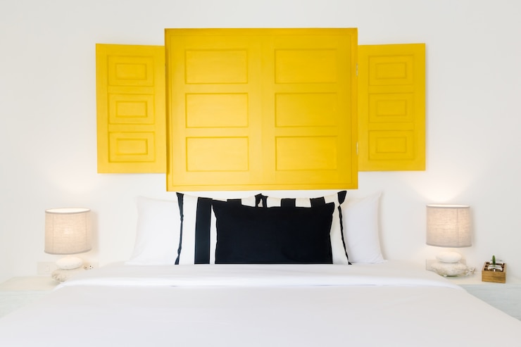Идеи дизайна с акцентами цвета для желтой спальни.