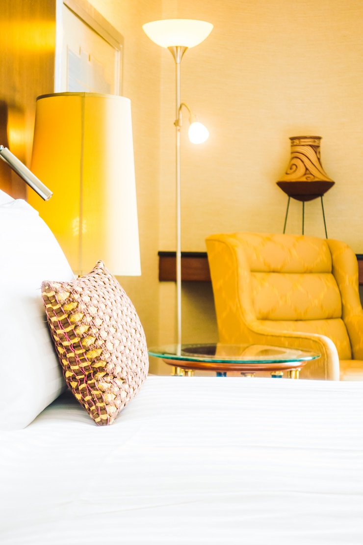 Цветовые решения для спальни с желтыми текстилем и мебелью.