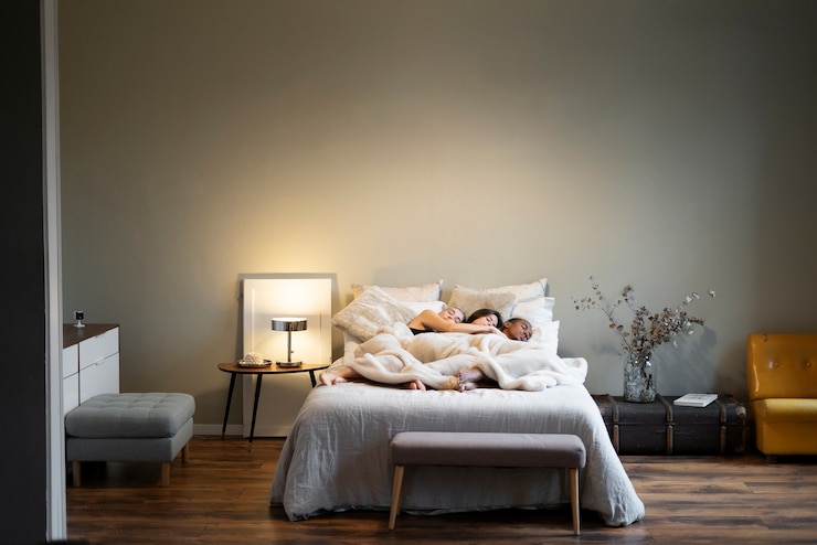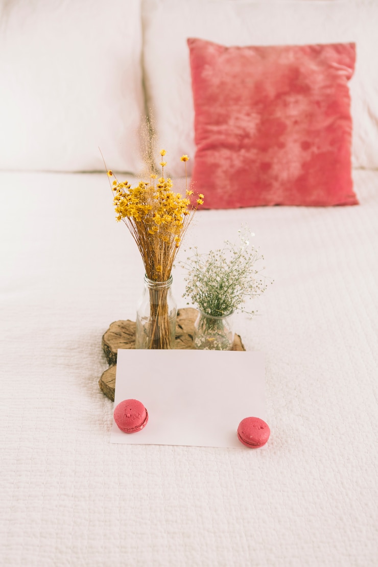 В декор спальни постепенно включайте желтые детали, достигая желаемого баланса. Сбалансированность жёлтой палитры станет очевидной при её равномерном распределении по комнате. Можно разместить на тумбочках лампы с жёлтыми абажурами и на противоположной стороне поставить зеркало в раме желтого цвета для объединения пространства.