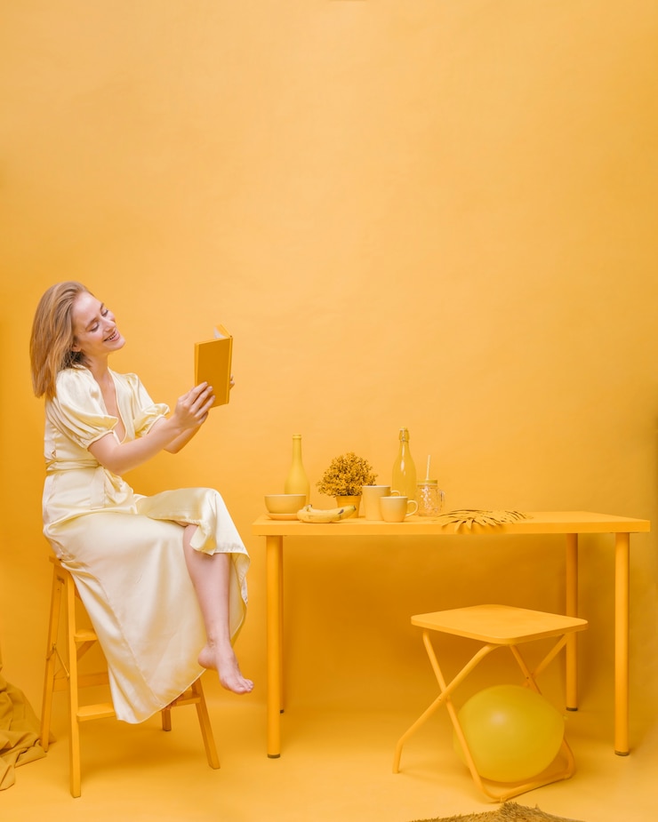 Добавьте желтый цвет неожиданно, например, установите желтые светильники. Покрасьте рамы тумбочек или стола с металлическими ножками в ярко-желтый, а не оставьте металл блестящим. В спальне поставьте письменный стол или туалетный столик с желтой столешницей и металлическими ножками.